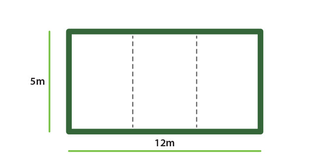 Voorbeeld: De oppervlakte van de denkbeeldige rechthoek rondom uw tuin is 7 bij 8 meter. Om uit te rekenen hoeveel rollen u nodig heeft, deelt u de 8 meter door 4. U heeft dan 2 rollen van 7 bij 4 meter nodig.